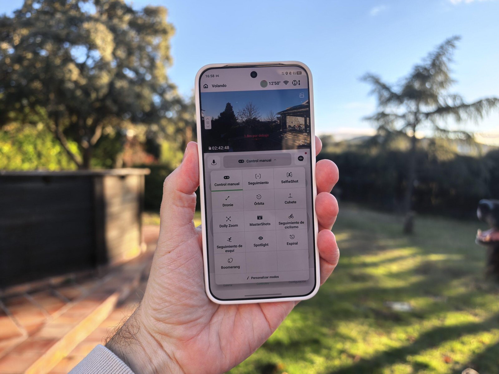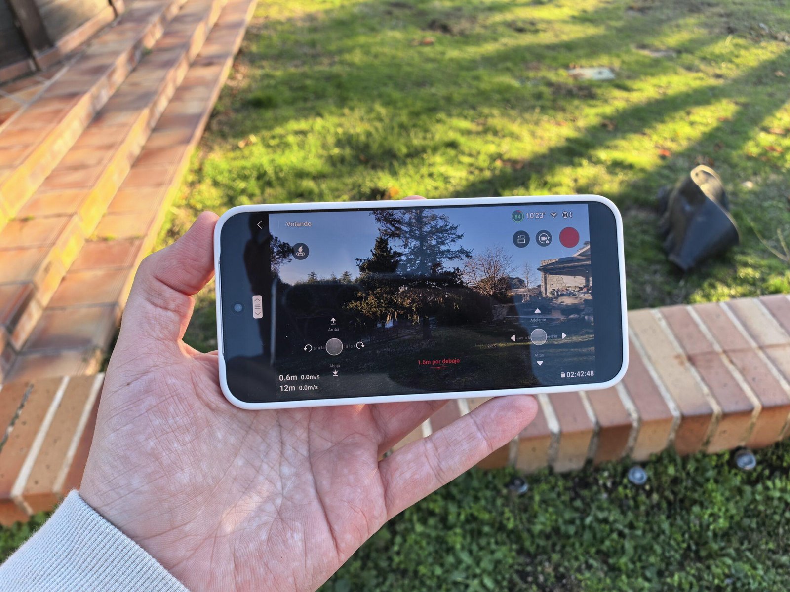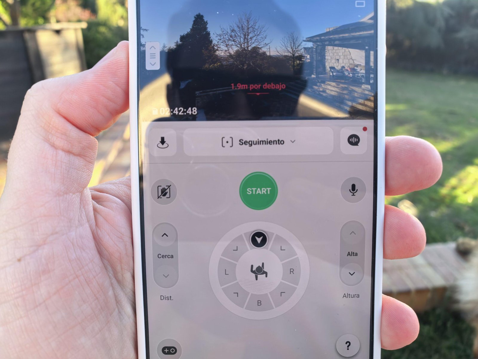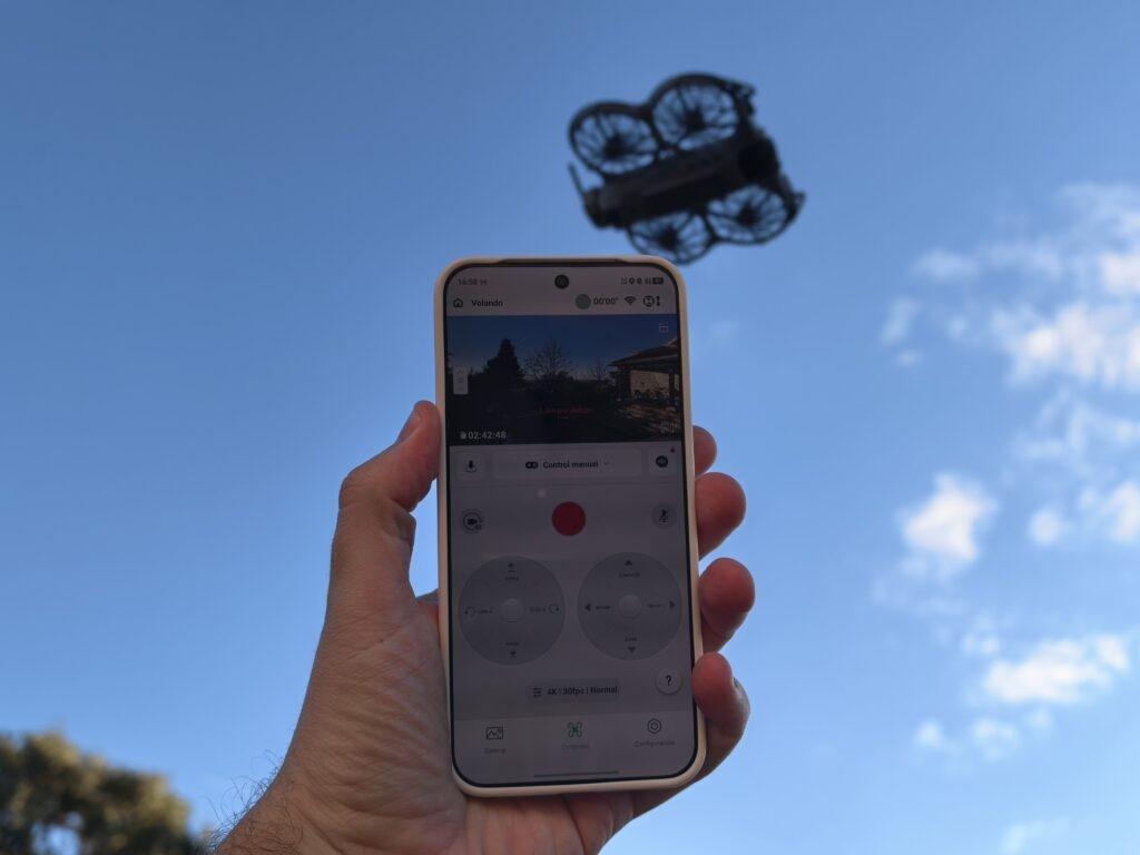 También puedes usar gestos para grabarte sin tocar nada. Se aprenden rápido y funcionan mejor de lo que esperaba, sobre todo cuando quieres grabarte pasando por delante del dron sin estar pendiente del mando. Y si quieres lo mínimo, tiene botones físicos en el propio dron para despegar y grabar al instante, que es algo que acabo usando más de lo que pensaba porque permite capturar planos improvisados en segundos.