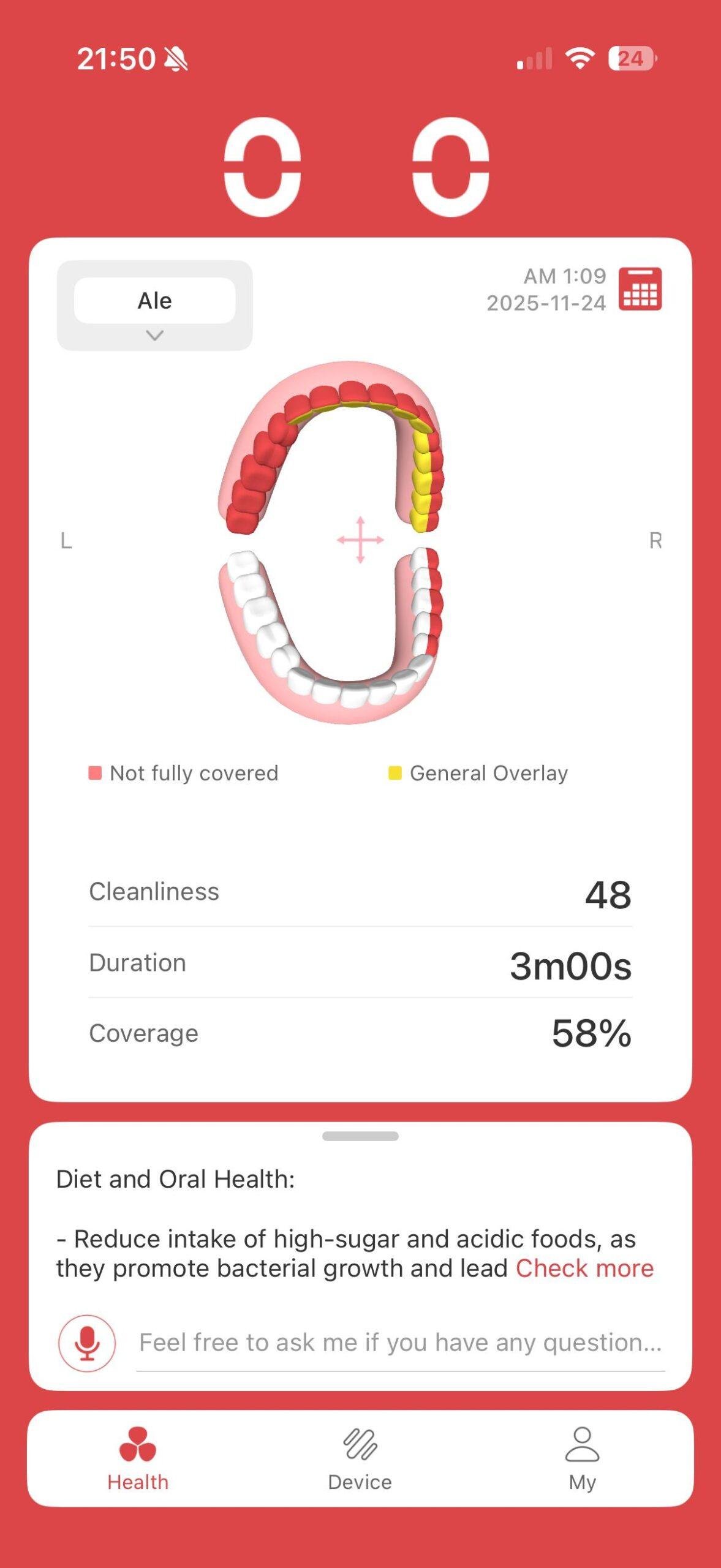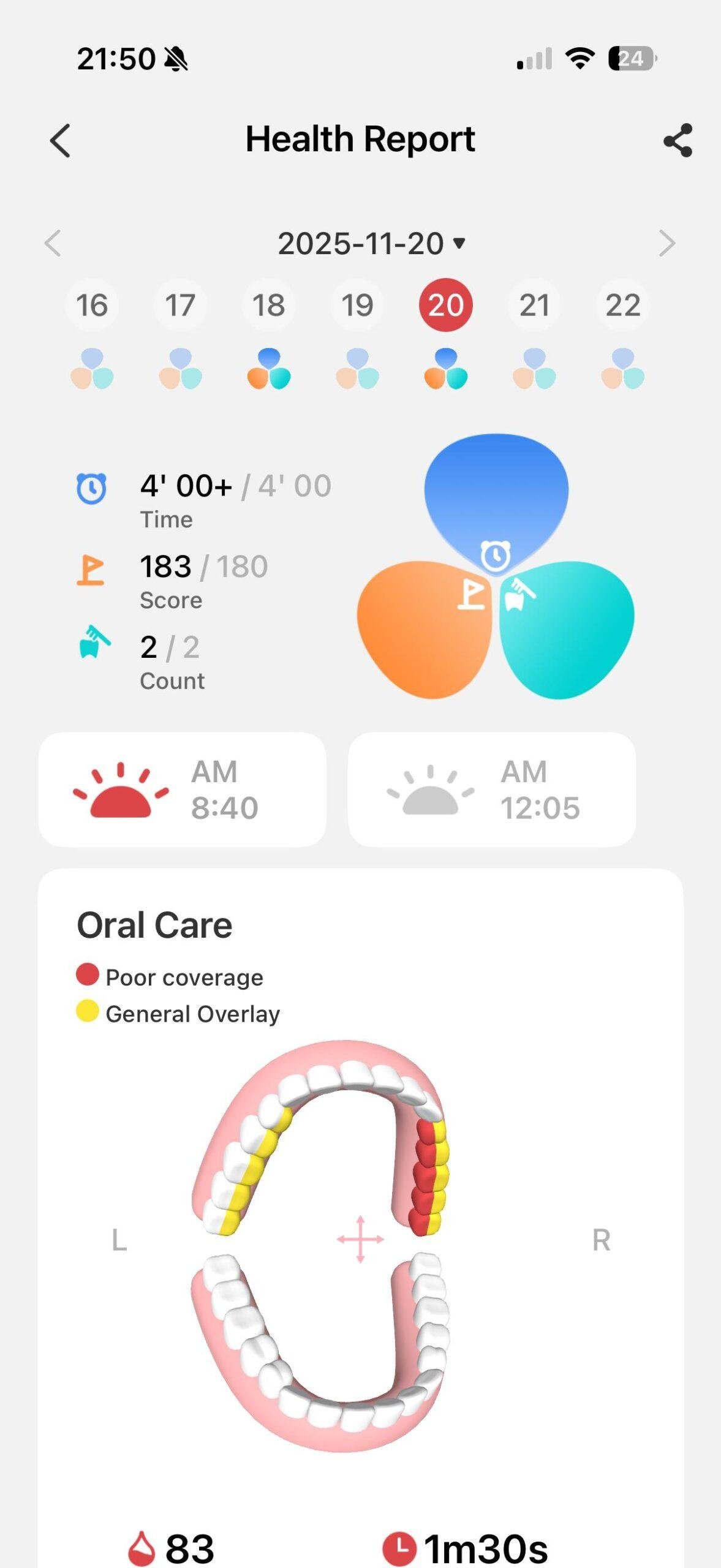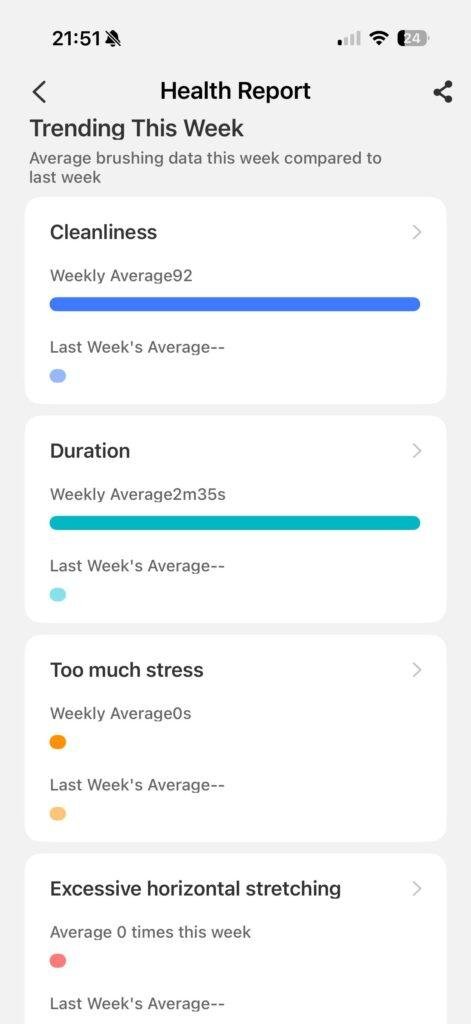 Entré pensando que la parte “smart” iba a ser el típico añadido que usas dos veces, pero aquí la experiencia es mucho más completa. La app de Oclean es realmente útil y no un simple panel bonito: ofrece historial de cepillados, presión aplicada, zonas no cubiertas y rutinas personalizadas, presentándolo todo de forma clara. En casa se ha convertido casi en un juego ver el mapa de zonas después de cada cepillado, algo que engancha más de lo que debería y que, al final, te hace cepillarte mejor sin darte cuenta.